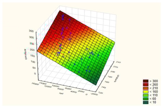 Surface graph of linear dependence between the sum of surface temperatures during the monitored days (sumsurface), sun exposure (rad) and the sum of air temperatures (sumair).