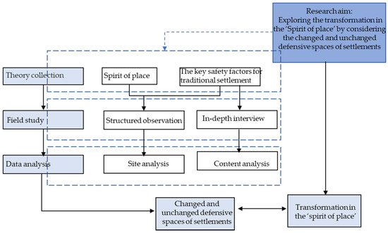 Two data collection methods (structured observation and in-depth interviews) and two data analysis methods (content analysis and site analysis) are used in the paper. The steps of this research include the collection of theories, field investigation, and data analysis (refer to Figure 1). The theories cover the spirit of place and defensive space, while data collection includes structured observations and in-depth interviews, and data analysis provides text analysis and places analysis.