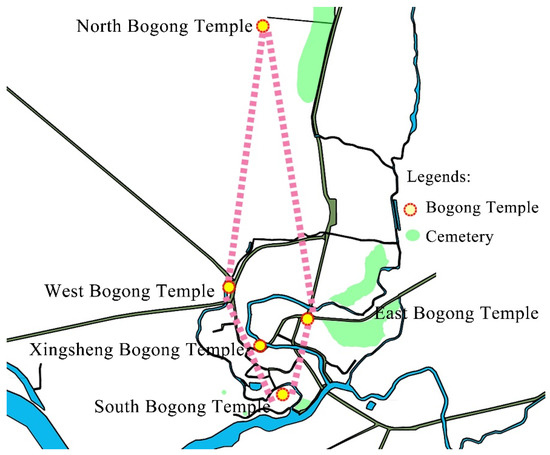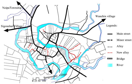 In terms of physical defence, nodes and the street network are the two elements in Wugoushui’s physical defences that have experienced minor changes but which still embody the physical aspects of the traditional spirit of place of Wugoushui. Nodes highlight the major venues of a settlement [14], and they are also places for residents’ daily activities [65]. In Wugoushui, the space surrounding the temples is where residents’ daily leisure activities take place. For example, Xizha Bogong is not only a place where residents meet and chat during the day but also one of the four Bogong temples in Wugoushui. Street networks assume the roles of movement paths and security [66]. Wugoushui’s street networks consist of streets interfacing the outside and internal alleys. The former is mainly for outbound transportation, and the latter is built for security following the brooks, hence their winding form. Although the existing nodes and street networks of Wugoushui no longer play a defensive role, they contribute to the characteristics of the settlement’s spatial layout.