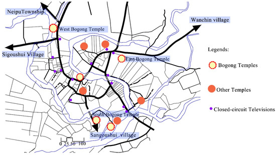 In Wugoushui, pass gates and Bogong Temples marked the entrances to the settlements, which mainly served the defensive purposes of resisting intrusion and access control. In the years before 1895, defensive pass gates were set up at the entrances. After 1895, these defensive gates were demolished. A comparison of Figure 3 and Figure 5 reveals that entrances to the Wugoushui settlement remained essentially unchanged. According to the interviews, residents believed the entrances were widened, and the original Bogong Temples in the east, west, south, and north of the settlement were well preserved. Changes in access control were reflected as follows: the road leading to the South Bogong Temple used to connect to Sigoushui, but now it has become an orchard path because a road was built between Wugoushui and Neipu. A decade ago, there were essential services such as grocery stores in the settlement and Wanchin next to the East Bogong Temple, where people could buy daily necessities. Now residents of the settlement buy daily necessities in Neipu via the west entrance. In short, access control of the settlement has not changed much in terms of spatial location, the Bogong Temples in the east, west and south are still present, but the direction and size of the traffic flows have significantly changed. The physical control of barricades in the past has now transformed into CCTV surveillance, as shown in Figure 3 and Figure 6, so access control as part of the physical defences is no longer in existence. The entrances’ location to Wugoushui has remained unchanged, but defensive facilities such as the pass gates and thorny bamboos at the entrance no longer exist. New alleys leading to the entrances of the settlement have been added (Figure 5).
