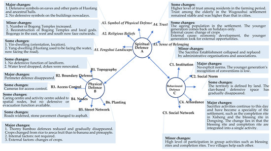 In terms of changes in the spirit of place, the analysis of the changes in defensive space using the 16 key criteria of a defensive space reveals the following: (a) Spiritually, religious beliefs, trust, and sense of belonging reflect the characteristics of residents’ daily life and interaction play the roles of mentally comforting and preventing others from intruding, and complement the physical defence. (b) Physically, nodes and street networks reflect the local characteristics of the settlement’s spatial layout. They are intuitive and visible structures of a place that provide residents with material-based mental security. (c) Behaviourally, institutions, territory, and social networks reflect the settlement’s cultural characteristics by connecting the society, operating institutions, and managing organisations. It can be seen that the establishment of the spirit of place depends on the objective environment and the subjective perception, and the development of a defensive space reflects personal needs and objective threats. Therefore, a close causal relationship exists between changes in defensive space and changes in the spirit of place. That is to say, different defensive spaces produce different spirits of place. In summary, changes in defensive space bring along changes in the spirit of place.
