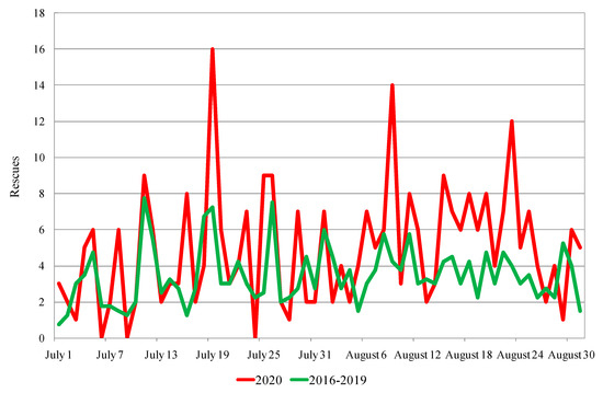 Daily distribution of rescues from 1 July to 31 August 2020 and equivalent period for 2016–2019.
