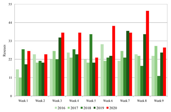 Figure 3 shows the weekly distribution (from Monday to Sunday) of rescues. In 2020, the first week corresponds to the period between Monday, 29 June and Sunday, 5 July, while the ninth (and final) week was between Monday, 24 August and Sunday, 30 August. Only in the fifth week (27 July–2 August) was the number of rescues below the figure for the same week in the period 2016–2019. Nevertheless, these differences were only magnified in three of the nine weeks: the fourth (20–26 July), the sixth (3–9 August), and especially the eighth (17–23 August—51 rescues). The largest number of rescues registered in a week, in any of the four reference years, corresponded to the seventh week of 2019, with 39.