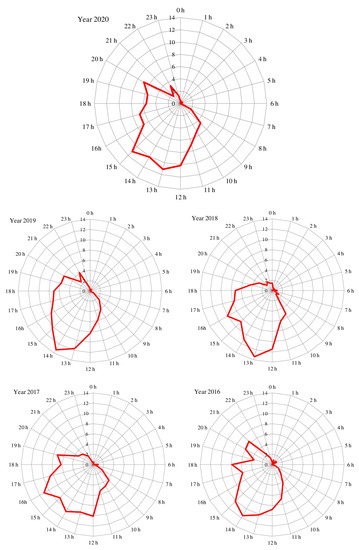 Figure 4 shows the relative frequency of rescues per hour in 2020, and for each of the four years in the reference period. The year 2020 showed no clear peak and a similar distribution from 12.00 to 15.00. The year 2017 showed a similar distribution to 2020 (from 12.00 to 16.00). However, 2016 and 2019 showed a marked peak at around 14.00, respectively, accounting for 10% and 12% of the total number of rescues in July and August. There was also a marked peak in 2018 at around 13.00 (>12%).