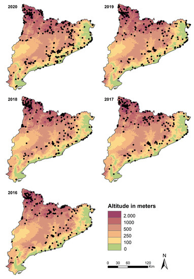 Figure 5 shows the spatial distribution of the rescues in 2020 and for each one of the four reference years. There were a lot of rescues in the northern area, corresponding to the Pyrenees, where several summits rise to heights of around 3000 m ASL. The distribution of the incident points on the map for 2020 also highlighted the Pre-littoral chain, which runs southwest to northeast. There, the highest summits are under 2000 m ASL. The locations of rescues also highlighted another mountain chain running parallel to the Pre-littoral chain and between it and the Mediterranean Sea (the Littoral chain), whose highest summits are under 1000 m ASL. It is also relevant to highlight rescues in areas along the coast, especially in the northeastern area of Catalonia (a rocky coast). The same pattern was found on the rest of the maps. The main difference was the large number of rescues in 2020, which outlined the Pre-littoral chain and, especially, the Littoral chain in a much clearer way.