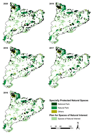 | 1 | For more details: GIS Catalan System of Natural Protected Spaces (http://sig.gencat.cat/visors/enaturals.html, accessed on 11 April 2021). |