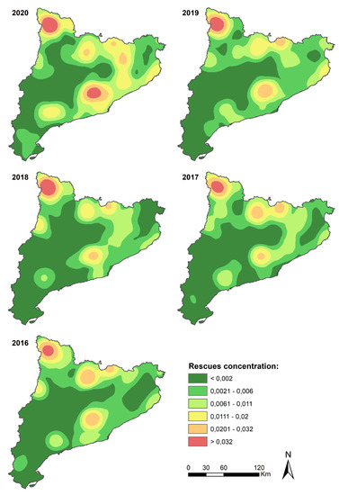 The number of rescues also increased in all three categories based on protection status: Specially Protected Natural Spaces (SPNS), Spaces of Natural Interest (SNI), and other natural areas. The numbers were very similar in the cases of SPNS and SNI (+20%), but significantly different for the third category, in which the number of rescues rose from 68 in 2016–2019 to 124 in 2020 (+80%)—the highest number in any of the three categories. However, the total surface area corresponding to the SPNS is almost 3200 km2 and that of the SNI is 7100 km2. This implies one rescue for every 30 km2 and 95 km2, respectively, while Catalonia has a total surface area of around 32,000 km2 (including urban areas).
