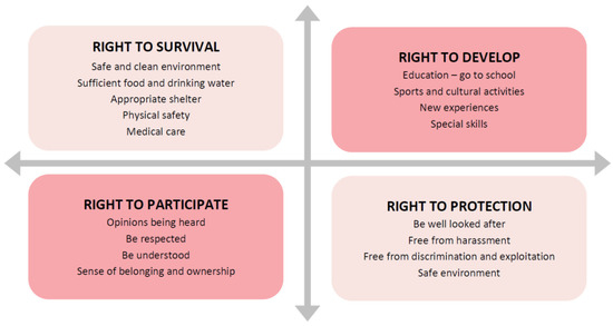 The United Nations Convention on the Rights of the Child [58] has four fundamental principles: (1) the right to non-discrimination (also called the universality principle)—i.e., the rights apply to all children without exception; (2) the best interests of the child—i.e., in all actions concerning children, the primary consideration must be what is in their best interest; (3) the right to life, survival, and development—i.e., all children have a right to develop physically, mentally, spiritually, morally, psychologically, and socially to their full potential and to enjoy the highest attainable standard of health; and (4) the right of the child to be heard—i.e., children have a right to express themselves freely on matters that affect them, to have their views taken seriously, and there should be avenues made available to enable them to participate [59,61]. The Convention addresses many other issues pertaining to children, including: separation from parents (Article 9); freedom of expression (Article 13); freedom of thought (Article 14); freedom of association and peaceful assembly (Article 15); the right to privacy (Article 16); the right of access to appropriate information (Article 17); protection from all forms of violence (Article 19); the right to health and access to health services (Article 24); the right to an adequate standard of living (Article 27); the right to education (Article 28); and the right to leisure, play, and culture (Article 31) [62].