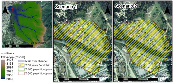 | Scenario | Tr (Years) | Flooding-Susceptible Areas (ha) | Floodplain Margin (m) | d (m) | v (m/s) |