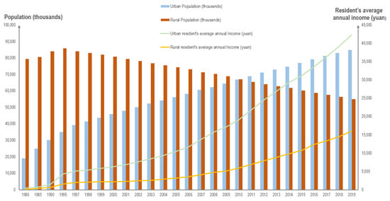 As the country used to have the largest rural population in the world, China has enjoyed the great benefits but also the negative consequences of high-speed urbanization [1,28,29,30]. The GDP per capita has increased from 1,378 yuan in 1988 to 69,876 yuan in 2019, a 51-fold increase [31]. However, fast development is not always desirable because of its adverse outcomes, such as the increasing wealth gap [32,33]. Figure 1 shows that the annual average income gap between urban and rural residents is increasing; the income of urban residents (i.e., 42,359 yuan) in 2019 was 2.65 times that of rural residents (i.e., 16,021 yuan). Real estate sales support China’s rapid urbanization [34] but at the cost of rapidly increased housing prices; the high-debt real estate market has become the largest ‘grey rhino’ in China [35]. Household debt by the end of 2018 in China was 60.4% of China’s GDP, and the household debt-to-income was over 99.9% [36]. This high debt has raised concern from global investors at the risk of a credit crisis [37]. Moreover, cities have been epicenters of COVID-19 [38], and many scholars have proposed a review of urban design, planning and management to achieve a society more resilient to future pandemics and disasters [39,40]. Government commitments to ensure both rural residents’ and rural-to-urban migrants’ livelihoods and their aspirations for a better life during the process of rapid urbanization have been questioned [29,41,42,43]. Although the Chinese government has insisted on putting people at the center of their policies, some assessments find that governments have focused on stabilizing their power and gaining revenue by prioritizing land exchange, agglomeration, and development [29,44,45,46].