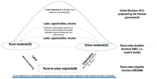 By following the traditional trajectory and being trapped in Scenarios 1 and 2, concerns of “bad governance” raised in many studies indicate the poor performance of governments in managing the needs of rural residents and migrants [29,32,120]. However, most scholars favor urban development [84,121,122]. Urban researchers regard rural residents (i.e., the subsistence sector) as prospective underemployed laborers available to “serve” cities, and urban residents (see Figure 2) [109]. The aspiration for a better and happier life for people living in rural areas is the ultimate driver to push them to move to cities [14,29,50]. From this perspective, in China, a special group of people is emerging: rural-to-urban migrants who are not rural residents nor “qualified” urban dwellers [121,123]. They have become the new burden of urbanization [124]. Because it meets both the needs of urban and rural residents, the ultimate way to handle this group of people is to speed up citizenization [125], a process of changing the status of non-urban residents to urban residents (e.g., hukou 户口, official urban residency) or empowering non-urban residents with almost the same rights as urban residents when living in cities (e.g., juzhuzheng 居住证, temporary residency) [50,85,120,126]. By doing this, urban residents can enjoy more stable living conditions, free from the insecurity of migrants, while benefitting from cheaper rural resources with modern and industrial agriculture [10,29,86,100]. Also, rural-to-urban migrants and potential migrants living in rural areas can enjoy a more prosperous life by living in cities, because small-holder farming in particular is no longer the best way to improve the income and livelihood of rural residents [85]. During this transition process, two groups of problems are emerging: problems caused by the flow of people from rural areas to cities [20] and the loss of people in rural areas [24]. For example, many scholars use Lewis’s model, which considers urban and rural areas as a dualistic structure (Figure 2), and follow the trajectory of urbanization-led success in development, to examine and assess the problems of urbanization, peasant workers, and rural residents [7,50,76,108,127,128,129].