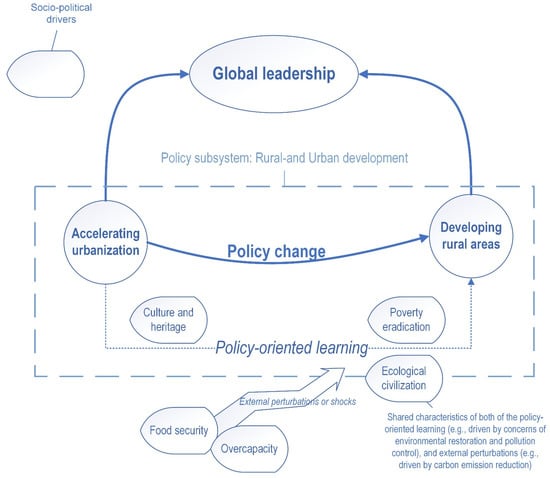 To explore the socio-political drivers of the plan (Q2), we follow two critical paths—policy-oriented learning and external perturbation—in the framework to uncover China’s policy change from speeding up urbanization to developing rural areas [56,61,143]. Policy-oriented learning describes the enduring alterations resulting from policy feedback within the policy system, despite external perturbation and shocks, such as changes in socioeconomic conditions, disasters, and redistribution of resources, to the policy system [56,61]. By following the two paths, we identify five socio-political drivers (Figure 4) to discuss China’s choice of developing rural areas.
