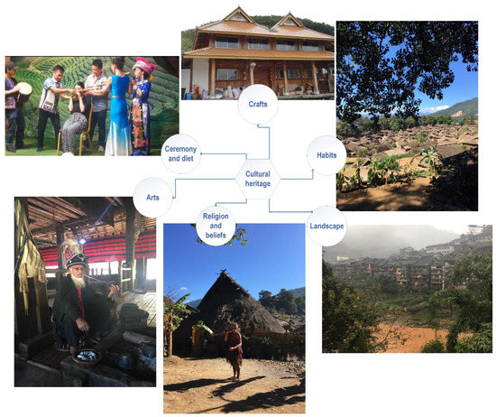China’s rural development plan has also contributed significantly to support Xi Jinping’s dream of “great rejuvenation” by adopting cultural heritage to project soft power [133,172]. Chinese history has been selected, constructed, and adjusted by the party since 1949 to achieve many political goals [173]. For example, the party has stabilized its power and united the nation by emphasizing China’s five-thousand-year-old civilization [133]. The promotion of China’s historical role as a global leader is used to gain current and future influence in global cooperation and competition [133]. Chinese history originated from farming culture along the Yellow and Yangtze rivers around 10,000 years ago [174,175]. Chinese beliefs, culture, and knowledge are rooted in rural areas; for example, the land and soil are regarded as the mother of all creatures in traditional Chinese culture [176,177]. In addition, Chinese rural communities have great diversity in ceremonies, architecture, customs, languages, lifestyles, arts and crafts, diets, and other cultural habits (Figure 5) [51,158]. Photos in Figure 5 show aspects of the rural cultural heritage of the Dai, Yi, Wa, Yi, and Miao people in Yunnan and Guizhou provinces. Most of these cultures are thousands of years old and thus have high cultural, social, economic, and ecological value. For example, the Om Din village (top right, bottom middle, and bottom left) is the last in China that maintains an aboriginal tribal culture [178], and Bing An (bottom right) is the largest collective village that retains extensive historic military, commercial, and transportation infrastructure [179]. Consequently, protecting rural cultural heritage can contribute to China’s soft power and show the party’s respect for the rights and interests of ethnic minorities.