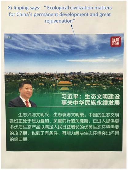 Government billboard promoting ecological civilization as China’s green deal to enhance the nation’s reputation and contribute to its global leadership (source© authors). Translation: Xi Jinping says: “Ecological civilization matters for China’s permanent development and great rejuvenation. Improved ecological conditions bring us a more civilized society. We are now facing severe stress on the way to achieving ecological civilization but I believe that China has the ability to sort out any challenges we meet.” (photo© authors).