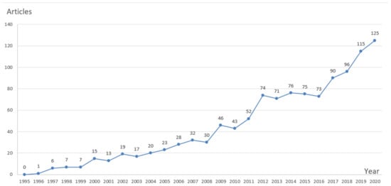 Web of Science (WoS) is one of the most comprehensive databases, providing a good basis for the reliability of the literature data. In the core dataset of WoS, we selected “genetic algorithm” and “land use” as key words, “All document types” as document type, and “1995–2020” as the time span; then we obtained 1154 articles including the author, title, abstract, keywords, and citations. Figure 1 shows the annual statistical results of the literature.