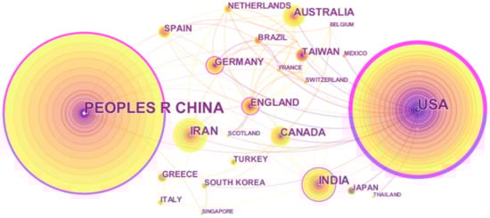 In CiteSpace, we use centrality (0–1) to measure the importance of a research object [36], and its measurement is related to the number of occurrences of two countries or institutions in the same article. The higher the centrality, the more active the country or institution is, indicating that they play a more important role in cooperative relationships. Among the top 15 cooperative countries in centrality (Figure 3, Table 1), China has the highest frequency with 274 articles, followed by the USA with 228 articles, which was the first country to conduct relevant research. There were 63 articles in Iran and 62 articles in India, ranking third and fourth, respectively. The number of articles published in England was 34, ranking seventh, but the centrality was 0.21, following China and USA, indicating that England is an active country in this research field and has great communication with other countries. China’s centrality was 0.28, indicating that China also plays a very important role in cooperative research.
