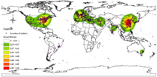 Kernel density analysis is a typical spatial hotspot analysis method. It assumes that there is a density value at any point in the study area; a smooth surface is constructed by calculating the density around the element in order to generate the transition from a discrete object model to a continuous field model. Roughly speaking, the purpose of kernel density analysis is to obtain an estimated value of each point of the density function that can approximate the data distribution, so as to show the distribution of data. Therefore, this method was used to visualize the global geographic distribution of the authors. In this article, BibExcel was used to geo-decode the authors’ locations in order to obtain the latitude and longitude of publication cities. Then, ArcMap 10.6 was used to perform kernel density analysis and display the geographic distribution of the authors.