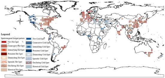 As shown in Figure 4 and Figure 5, the main spatial clusters of authors are in the USA, Europe, and East Asia. In the USA and China, most of the authors are from the east and coastal areas instead of west. In East Asia, the authors are mainly concentrated in China, Japan, and South Korea. The clusters of European authors are mainly located in England, Spain, Germany, Italy, Greece, and Netherlands. In West Asia, there are clusters in Iran and Turkey. There are also spatial clusters of authors distributed in India and Australia. Brazil is an exception: the distribution of authors does not form a cluster, although there are many authors with productive output. Figure 5 shows the spatiotemporal hotspot analysis results. Emerging hot spots are concentrated in Europe, India, Southeast Asia and Australia. There are continuous hotspots in the northeastern USA, eastern China, and western Europe, indicating that these areas have played an important role in this research over a long period of time; Central America, Central China, and Southeast Asia are fluctuating hot spots, indicating that although there are many related studies, they have not become long-term hot spots.