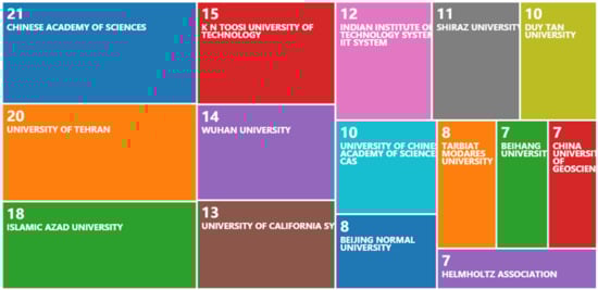 Table 2 shows the centrality of the cooperative institutions. The Chinese Academy of Sciences has the highest level of activity, with the largest number of documents and the highest centrality of 0.39. Wuhan University published 20 articles, but its centrality is 0.08, indicating that this research institution pays more attention to internal communication and lacks communication with other institutions. Following Wuhan University, Tehran University, Aristotle University, the Chinese Academy of Sciences, and Purdue University have all issued more than 10 articles, but their centrality is still low at less than 0.1, indicating that they have little influence on other related institutions around the world. In general, in order to strengthen research in this field, it is necessary for institutions to emphasize communication and cooperation.