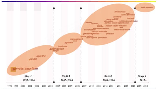 In CiteSpace [46], setting the time period to “1995–2020”, selecting “keyword” as the node type and “TOP50” as the threshold, we obtained a co-occurrence map of keywords, including 712 nodes and 2383 links. We then generated the time-zone map (Figure 7). In the keyword time-zone map obtained by running the software, each point represents a keyword; the keywords shown in the figure were the first high-frequency words used, which was a new hot spot in the research direction during each period. Therefore, according to the number of keywords that appear for the first time in each time period, we divided the development process of GA-LUO into four stages in this article.