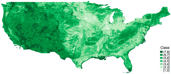 The full set of explanatory variables is listed in Table 3. Elevation, slope, and capability class data were obtained from the USDA Natural Resources Conservation Service soils data base gSSURGO [38]. The land capability classes (LCC) span from class 1 to class 8, with class 1 indicating the land most suitable for cultivation and class 8 the least. Figure 1 presents the capability class data for non-irrigated lands. For ease of interpretation, we converted LCC to a weighted average by 10 km × 10 km grid cell, resulting in a continuous measure between 1 and 8.