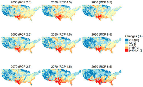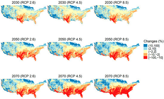 Percentage changes of pastureland share between 2016 and select time periods under alternative representative concentration pathways.