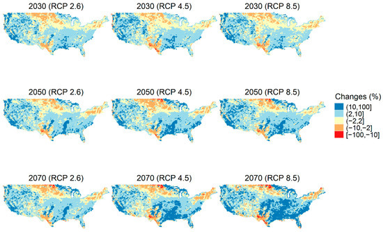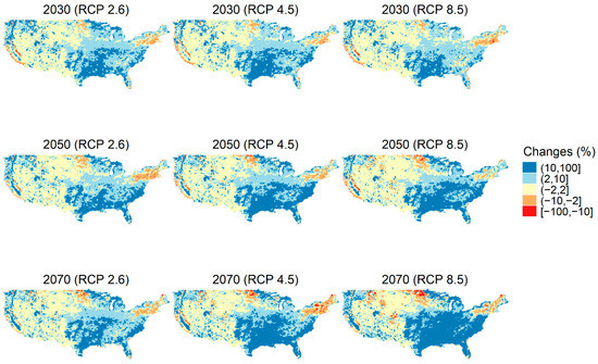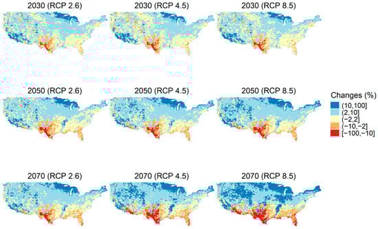Percentage changes of grassland share between 2016 and select time periods under alternative representative concentration pathways.