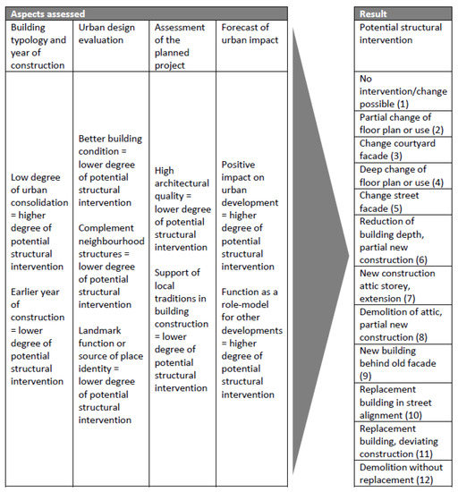 The Matrix now intersects the specification of a single building in the four aspects (building typology, urban design evaluation, assessment of the planned project, forecast of urban impact) with the respective degree of consolidation of the specific zone, or specification in the other aspects. In each case, the most “sensitive” sub-evaluation is decisive for the result. In accordance with the Matrix, the less consolidated the area under consideration, the more structural interventions are imaginable for a building under monumental protection (see Figure 4).