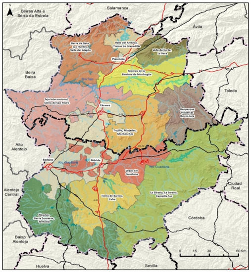 Tourist areas of Extremadura (Spain). Source: Tourism Observatory of Extremadura, Quarterly bulletin of tourism supply and demand in Extremadura Fourth-Quarter 2018 Document (14/2018). p. 78. https://www.viajarporextremadura.com/cubic/ap/cubic.php/doc/Guia-de-Extremadura-11.htm, accessed on 10 April 2021.