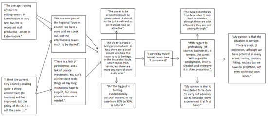 The first approach to the analysis of the discourse of the focus groups has been carried out by means of a “tree of relationships”, which hierarchically integrates each of the sets of ideas and opinions expressed (Figure 3). The different contributions flow from the axis “training” + “municipal intervention” in tourism, in line with Hardy’s [16] approaches, and conclude with a certain vision of “the situation”, which is, in the opinion of the majority, “regular”. Figure 3 shows the most significant literal expressions; those that best summarize the opinion of the group as a whole.