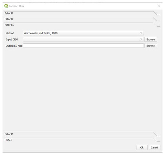 An open-source GIS application was already developed to estimate the annual soil loss [30]. However, this application implemented the RUSLE equation according to the methodology proposed by Wischemeier and Smith [4]. In this work, a new open-source GIS application, Erosion Risk, was developed under QGIS 3.18 Zurich software [34], implementing different methods for each factor involved to estimate soil loss, giving the user the possibility of choosing the best method to use (see Supplementary Materials). The application was developed using the Python programming language and several algorithms from Processing Toolbox packages, such as GRASS, SAGA, and GDAL, among others [35,36,37]. In addition, modules from Qt API, QGIS API and PyQGIS API were used to develop the code [38,39]. Due to the authors’ experience in developing QGIS plugins and due to the integration of several external algorithms in this software [40], QGIS was chosen to implement the application. The Plugin Builder was used to start the creation of the plugin. The Erosion Risk application is composed of a single button that opens the main window, and the GUI was created through Qt Designer framework. The main window is composed of a toolbox widget, which provides a series of pages or compartments in a toolbox [39]. Figure 1 presents the Erosion Risk main window (with the LS factor page opened).