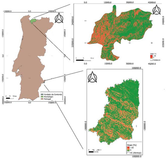 The hydric erosion methodologies involved in the application were tested in two different regions in Portugal: (i) mountainous and rainy region (Montalegre, North of Portugal); and (ii) dry and flat region (Alentejo, South of Portugal; Figure 2).