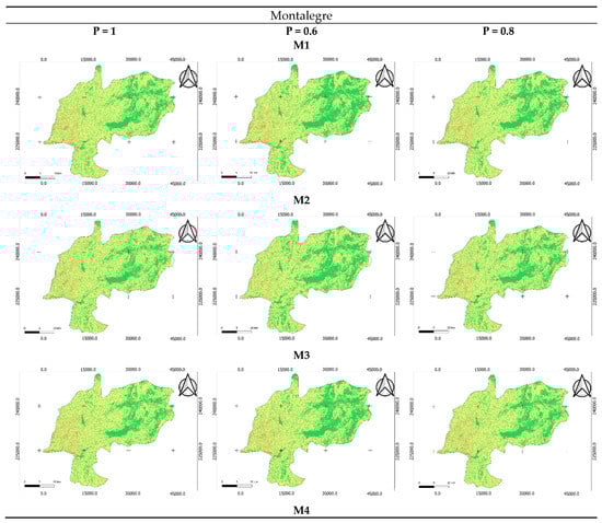 Figure 3 and Figure 4 illustrate the spatial distribution of the potential soil erosion risk map of Montalegre municipality and Alentejo region, respectively. The annual average soil loss was grouped in three categories: 0–25 (green), 25–55 (yellow) and >55 (red) (ton/ha·year). The maps were created using different combinations between eight methodologies. Additionally, different P values were assigned (1, 0.8, and 0.6). Overall, in the Montalegre municipality, which is characterized as a rainy and sloped region, the category >55 (ton/ha·year) was mainly observed in the Southwest zone of the municipality in all maps of soil erosion rate for all the methodologies, emphasized by the M5 and M6 methodology. This result is expected since these zones are influenced by higher slopes, and areas with high slope values are related to a high level of erosion [30]. The category with less soil erosion, 0–25 (ton/ha·year), mostly covered the Northeast zone of Montalegre. This was also verified in all the methodologies.