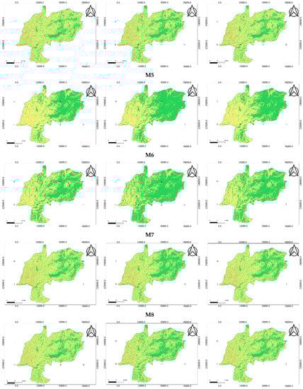 Considering the overall tested methodology, in Montalegre (82,330 ha), 33.8% of the land surface was classified as having low soil erosion (0–25 ton/ha·year), 15.6% was classified as having a moderate soil erosion risk (25–55 ton/ha·year) and 50.6% of the area was classified as having high soil erosion risk (>55 ton/ha·year). In the first and in the second categories (Figure 5a,b), is possible to verify that all the methodologies are above the average value, except for M5 and M6, indicating that these methodologies are more conservative, compared with M1, M2, M3, M4, M7 and M8. Considering the third category (Figure 5c), where the erosion risk is higher, the opposite of the previous conclusion is observed; M5 and M6 are lower than the average value.