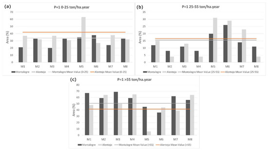 Percentage of area (%) of each region (Montalegre with a total area of 823,230 ha and Alentejo with a total area of 4830 ha) in each class for P = 1: (a) 0–25 ton/ha·year; (b) 25–55 ton/ha·year; (c) >55 ton/ha·year. The lines represent the mean values for each region and within each class. The methodologies are represented as: M1 Rw × Kw × LSw; M2 Rjrc × Kjrc × LSw; M3 Rw × Kw × LSm; M4 Rjrc × Kjrc × LSm; M5 Rw × Kw × LSmw; M6 Rjrc × Kjrc × LSmw; M7 Rw × Kw × LSmc; M8 Rjrc × Kjrc × LSmc.