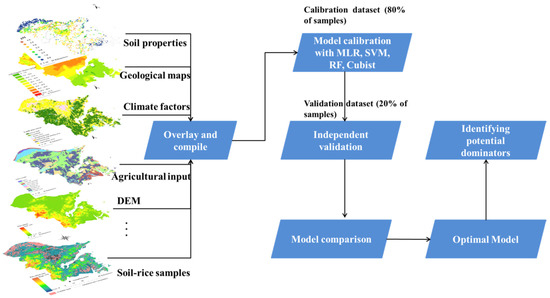 Exploratory data analysis was performed using R (R Core Team, 2015). The MLR, RF, SVM, and Cubist algorithms in the caret package [62] for R were used to construct models for predicting BACs of PTEs in soil–rice systems. The flowchart of this study was presented in Figure 2.