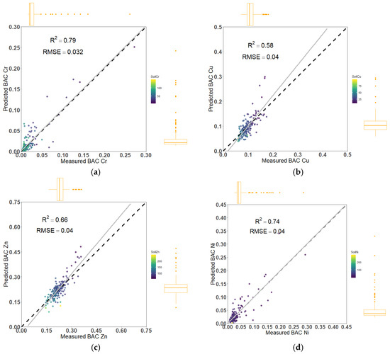 Comparison between the measured and RF-predicted BACs of Cr (a), Cu (b), Zn (c) and Ni (d) in validation dataset (N = 182).