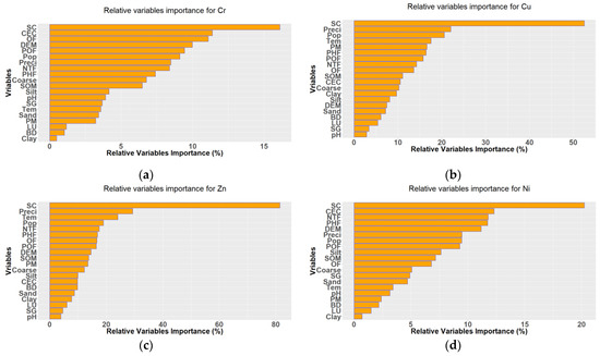 Relative importance of variables for modeling BAC of Cr (a), Cu (b), Zn (c) and Ni (d) (Abbreviations: SC, PTE content in soil; SOM, soil organic materials; CEC, Cation exchange capacity; Preci, annual average precipitation; Tem, annual average temperature; PHF, amount of phosphate fertilizer applied annually; OF, amount of organic fertilizer applied annually; NTF, amount of nitrogen fertilizer applied annually; POF, amount of potash fertilizer applied annually; BD, soil bulk density; DEM, elevation; PD, population density; SG, soil group; LU, land use; PM, parent material).