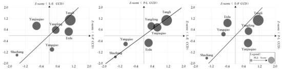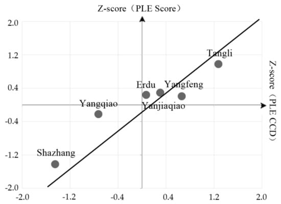 As shown in Table 5 and Figure 5, the PLE score and the PLE CCD are not strongly correlated. Yangfeng Village (61.88), Erdu Village (62.35) and Yanjiaqiao Village (62.71) have similar PLE scores. Among them, Yangfeng Village is the lowest, but it has reached coordination and integration period in PLE development stage (0.76), higher than the other two villages’ 0.63 and 0.68 (Running-in and adjustment period).