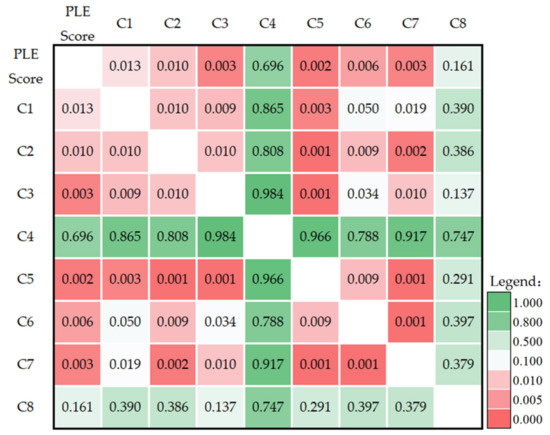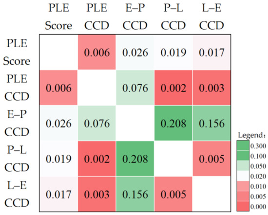 After Z-score processing, the relationships among the CCDs of PLE, L–E, P–L, and E–P can be seen more intuitively (Figure 7). Figure 8 shows the significance of Pearson results between the PLE score, PLE CCD, and pairwise mutual CCDs. When the significance is less than 0.05, the samples have a relatively significant linear correlation (light red); when the significance is below 0.01, the samples have an extreme significant linear correlation (bright red). Specifically, the PLE CCD shows a strong linear relationship with P–L (0.002) and L–E (0.003), respectively, as shown in Table A2 of Appendix A. Moreover, P–L shows a strong correlation of 0.005 with L–E. It can be seen that the living function acts as a bridge for the interaction between the production and ecology functions. It has demonstrated that the living protection for traditional villages is a key link to realize the coordinated development of PLE, which is inconsistent with the general belief that the better the production or ecology, the better the PLE development of village. In addition, PLE CCD shows a strong correlation of 0.006 with PLE score, demonstrating that the comprehensive development of three aspects is an effective way to realize the living development trend of “seeing people, things, and living” in traditional villages.