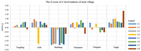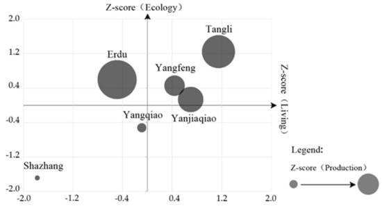 The difference among the studied villages in terms of production, living, and ecology can be directly seen after Z-score normalization (Table 6). To better show the difference, the villages’ Z-scores of production, living, and ecology at layer B can be transformed and put into a coordinate system (Figure 9). The larger the circular area in the figure, the higher the village’s Z-score in the production.
