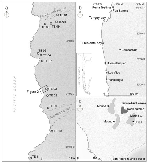 - Salazar, D.; Arenas, C.; Andrade, P.; Olguín, L.; Torres, J.; Flores, C.; Vargas, G.; Rebolledo, S.; Borie, C.; Sandoval, C.; et al. From the use of space to territorialisation during the Early Holocene in Taltal, coastal Atacama Desert, Chile. Quat. Int. 2018, 473, 225–241. [Google Scholar] [CrossRef]