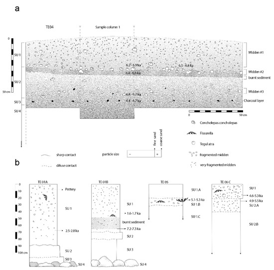| TE06C | U1, SU2 (20–30 cm) | D-AMS 030134 | 5210 ± 32 BP | 4860–5460 cal BP | Test, Loxechinus albus |