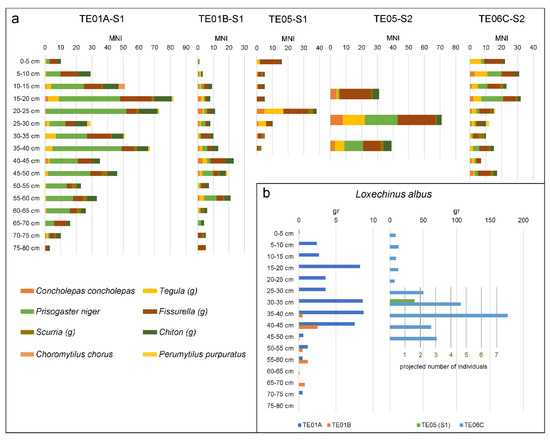 - Báez, P.; Arata, J.; Jackson, D. El loco Concholepas concholepas (Bruguière, 1789) (Mollusca: Gastropoda: Muricidae) como recurso durante el Holoceno Temprano-Medio en Los Vilos, Chile central. Investig. Mar. 2004, 32, 107–113. [Google Scholar] [CrossRef][Green Version]