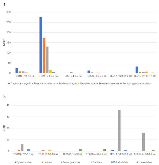 - Rebolledo, S.; Béarez, P.; Salazar, D.; Fuentes, F. Maritime fishing during the Middle Holocene in the hyperarid coast of the Atacama Desert. Quat. Int. 2016, 391, 3–11. [Google Scholar] [CrossRef]