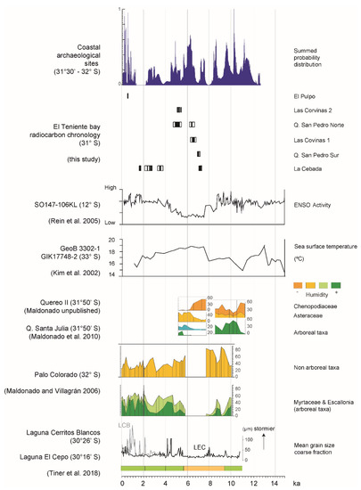 - Maldonado, A.; Méndez, C.; Ugalde, P.; Jackson, D.; Seguel, R.; Latorre, C. Early Holocene climate change and human occupation along the semiarid coast of north-central Chile. J. Quat. Sci. 2010, 25, 985–988. [Google Scholar] [CrossRef]