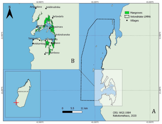Map of the study site showing the Velondriake LMMA (A) and the Baie des Assassins with its mangrove coverage and villages (B).