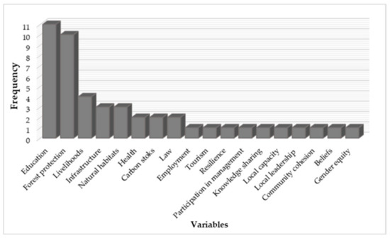 Within the 18 variables retrieved education, forest protection, and livelihoods of people were frequently quoted to be more affected by the project. Certain participants within the groups also took into consideration of the variables like infrastructure, natural habitats, health of people, carbon stocks, and law to be affected. Variables such as employment, tourism, resilience to natural hazards, participation in management, knowledge sharing, local capacity, local leadership, community cohesion, bieliefs, and gender equity were fewly quoted (Figure 3).