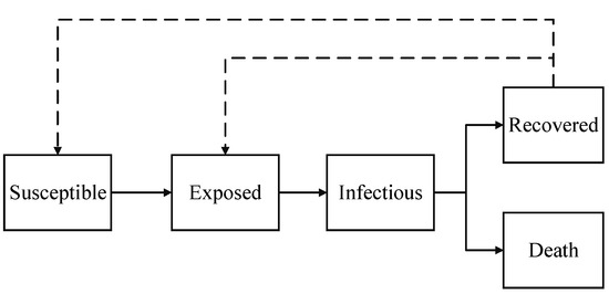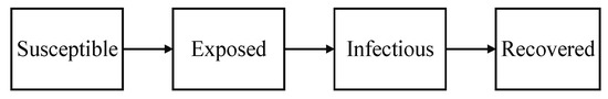 The susceptible-exposed-infectious-recovered (SEIR) model is a common infectious disease model that usually expresses a complex infectious disease system through multiple equations [14]. In the SEIR model, people are divided into four classes, namely: susceptible (referring to healthy people, who have a certain probability of being infected after contact with an infected person), exposed (referring to people who are infected by the infectious disease, but temporarily cannot propagate the disease to other people), infectious (referring to patients with infectious disease, who can transmit the disease to healthy people), and recovered (referring to patients who are cured) [15,16]. The relationships between these four classes are shown in Figure 1.