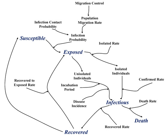According to Equations (6)–(11), an SEIR-SD-CA causality loop diagram is constructed for COVID-19 (Figure 3), which is used to conduct dynamic simulation research on the epidemic situation.